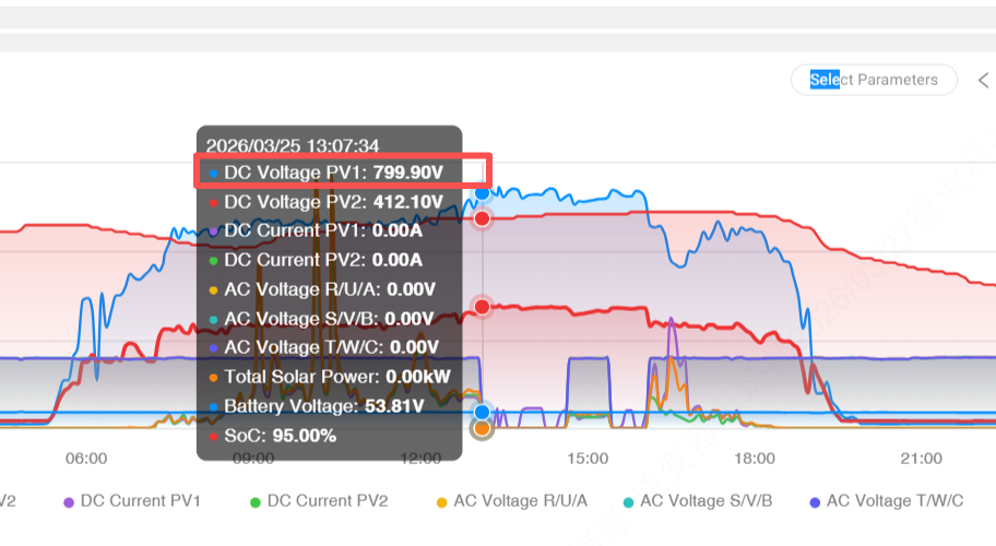 Questo caso è tipico: il numero di serie di stringhe PV1 è troppo elevato, quindi la tensione a circuito aperto raggiunge 799,90 V, superando di gran lunga quella dell'inverter ' s input consentito. In caso di forte irraggiamento si attiva inevitabilmente la protezione da sovratensione. Alcuni casi mostrano anche uno squilibrio tra PV1 e PV2 nel tipo di modulo o nel numero di stringhe, causando il superamento della tensione di sicurezza in una stringa.